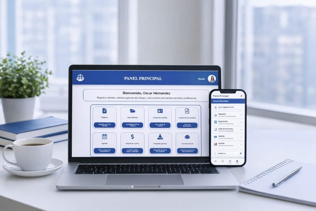 Usa Quantum desde tu computadora o celular para consultar información, organizar archivos y mantener seguimiento de tu operación jurídica, además de apoyarte en herramientas de inteligencia artificial